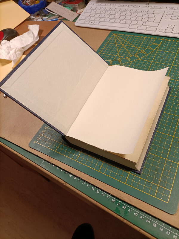 Das hört sich gar nicht so kompliziert an. Muss ich mir mal bei einem Testbuch anschauen. Wenn man so was zum ersten Mal macht, muss es ja nicht gleich ein Buch für einen anderen sein. Hier war ich froh, das wieder so hinbekommen zu haben. Der alte Einband war auch mehr Kunststoff als Leinen, da hätte das sicher gut gepasst, getraut hätte ich mich dennoch nicht.